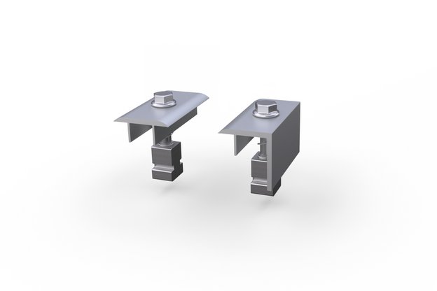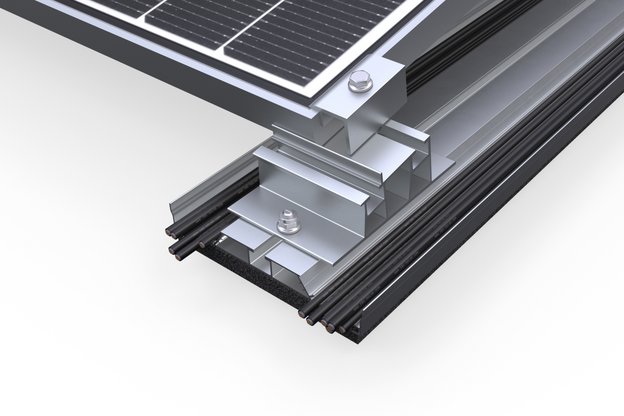 Fixation des modules solaires aux angles. Avantage : montage rapide, simple et optimisé en termes de matériaux. Avec les modules de grande taille, le risque que ceux-ci se déforment et ne résistent pas aux contraintes exercées par le vent ou la neige est accru. C'est pourquoi la fixation par serrage aux angles est idéale pour les petits modules et les conditions simples.